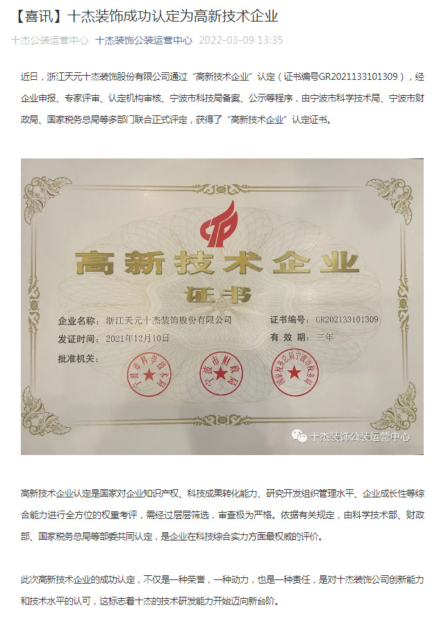 【喜訊】十杰裝飾成功認定為高新技術(shù)企業(yè)