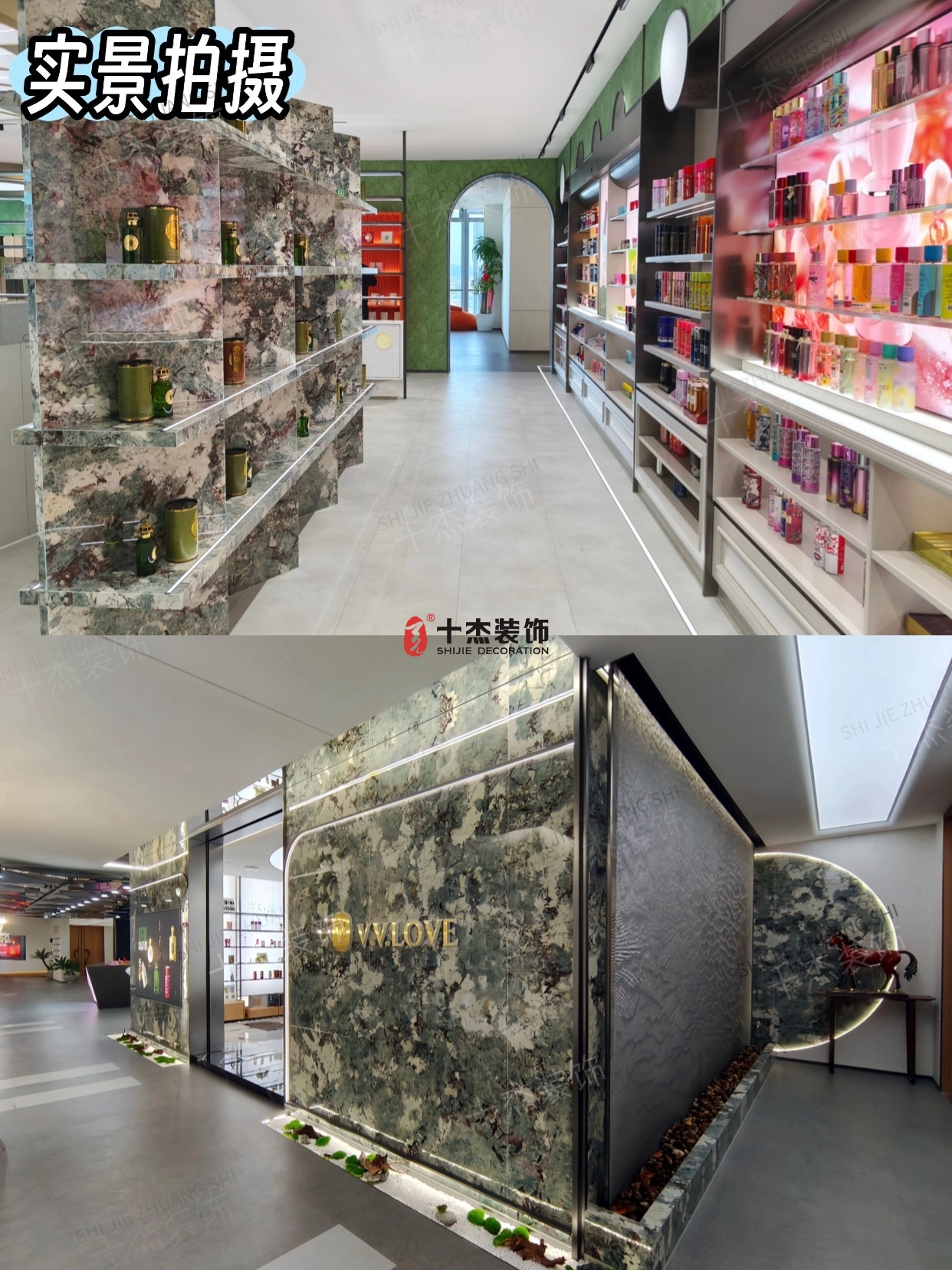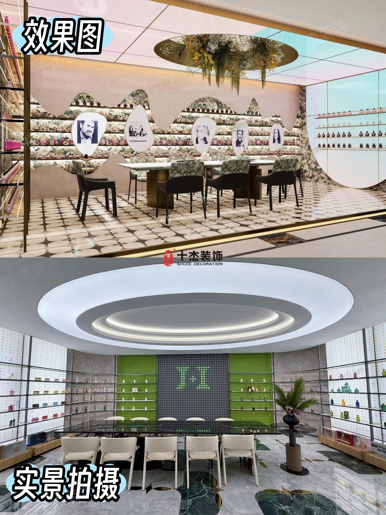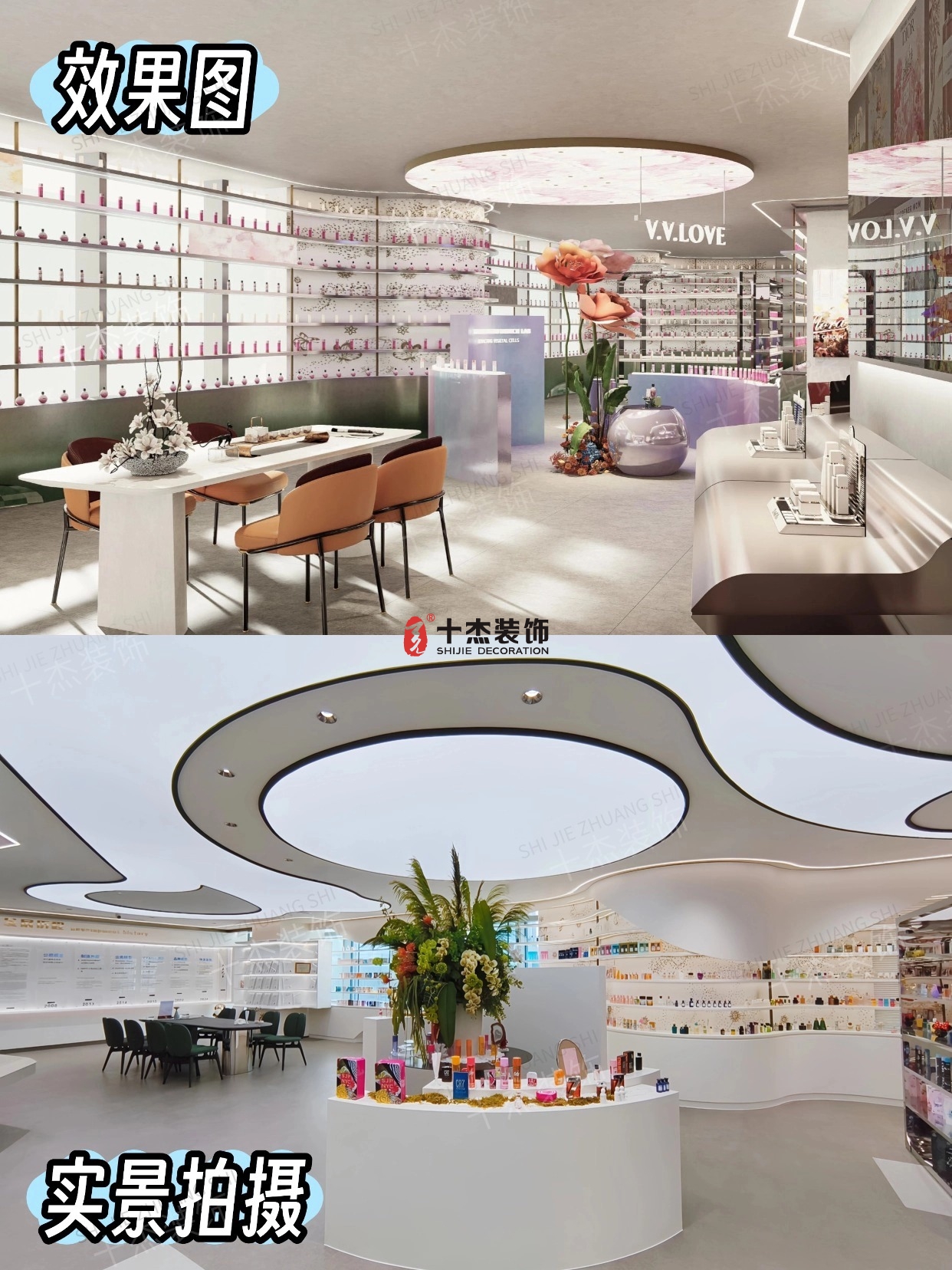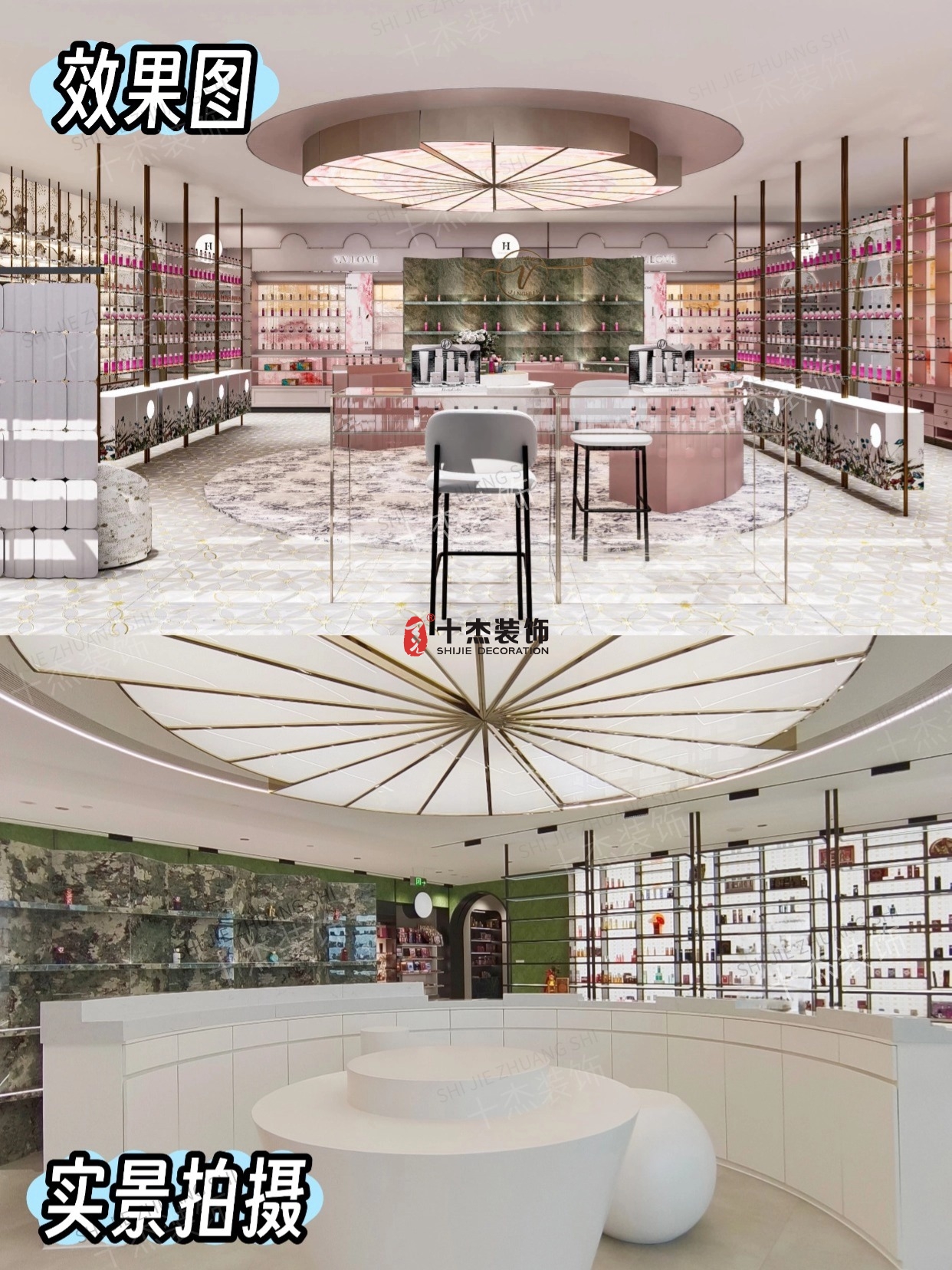 效果圖里的扇形柔光頂、墨綠大理石展示墻、粉金漸變的產(chǎn)品架