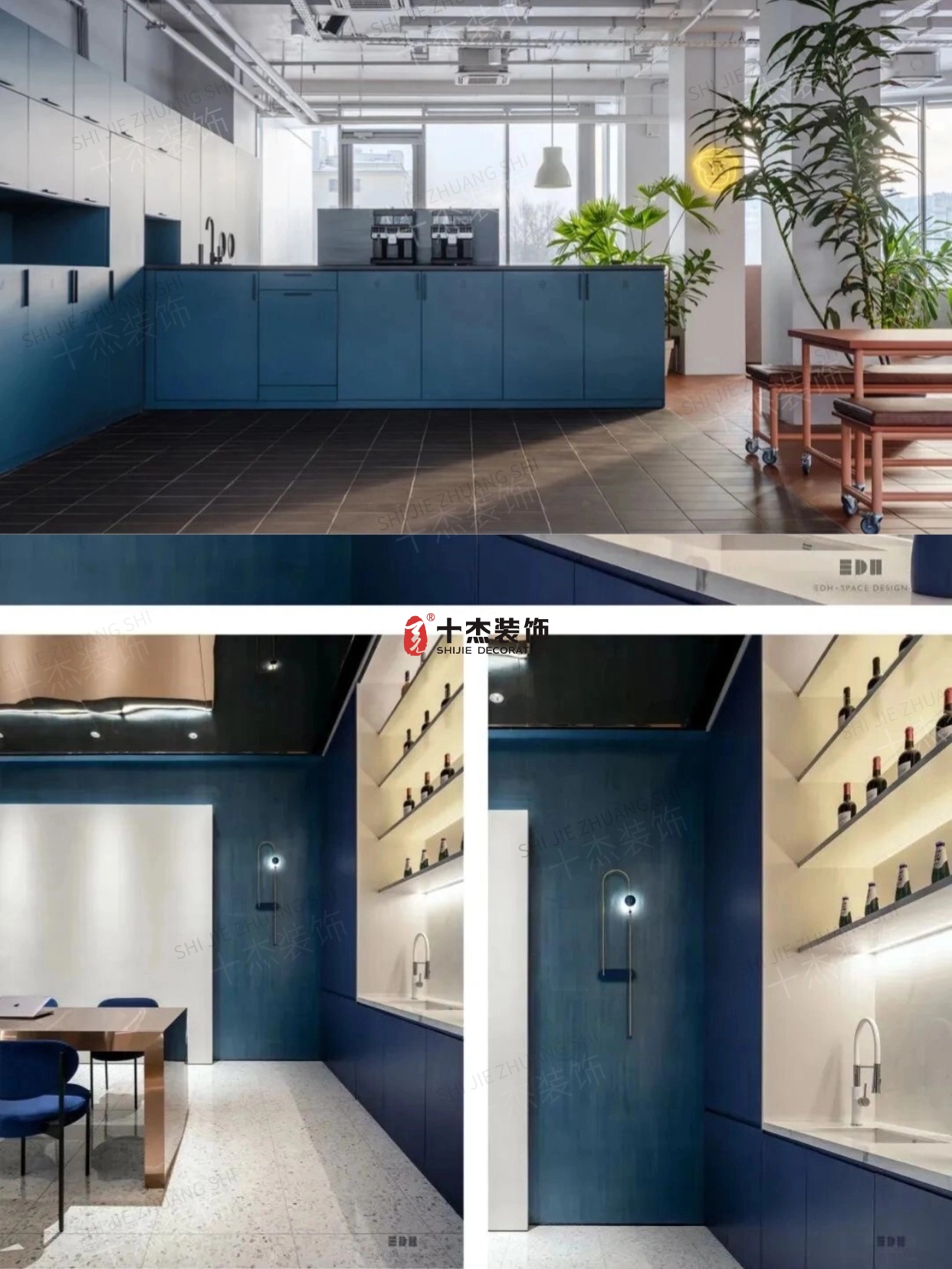 中和:前臺橙墻 + 辦公區(qū)白墻(貼創(chuàng)意貼)+ 原木茶水柜