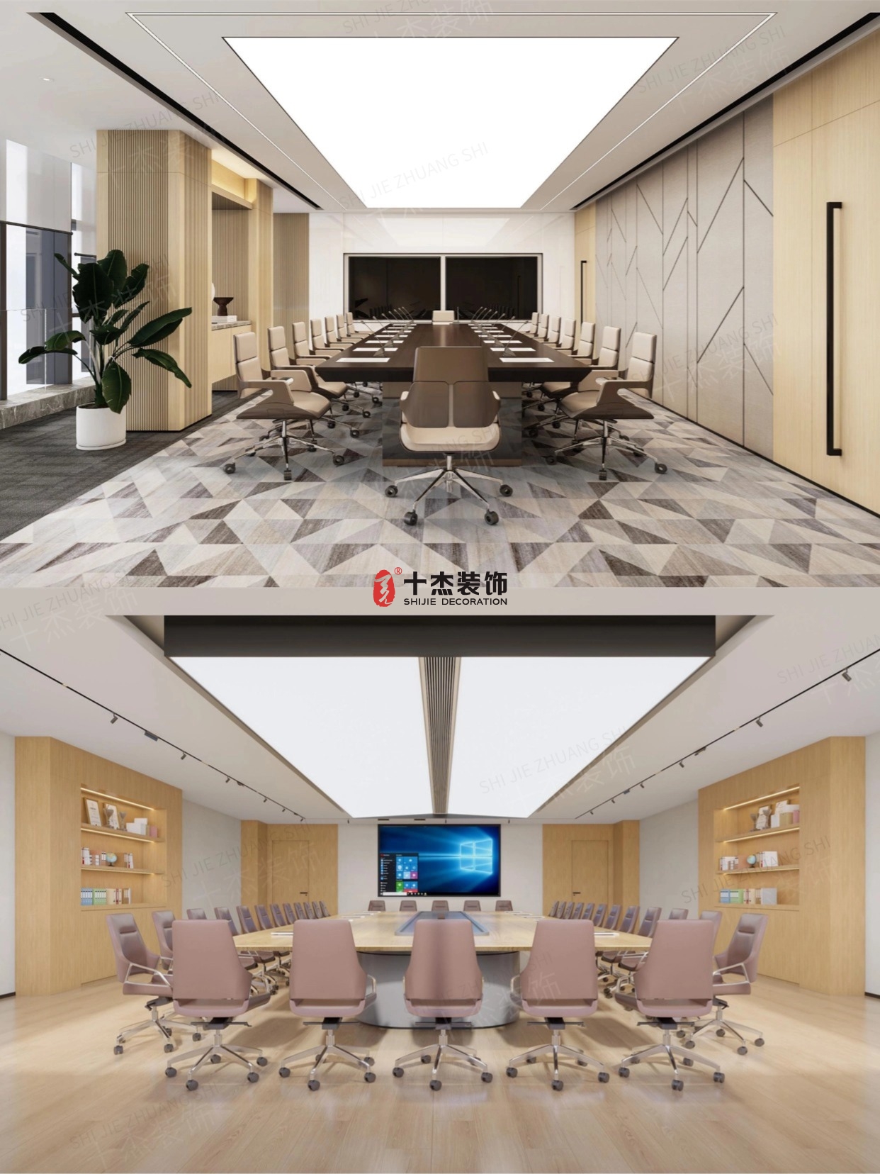 淺木色長(zhǎng)桌 + 柔粉色座椅,兩側(cè)嵌入式書架擺上企業(yè)榮譽(yù)或書籍