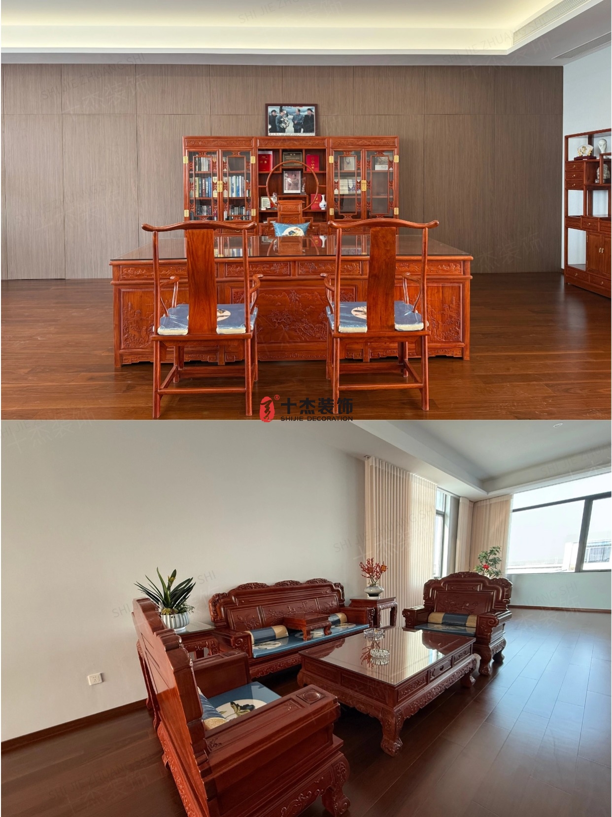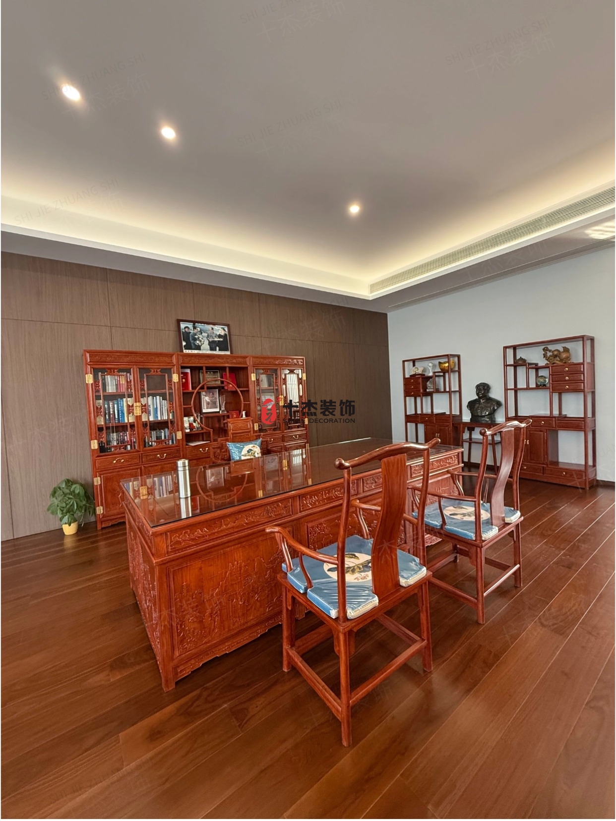 桌、整面書柜、會客沙發(fā)全是同系列實木雕花