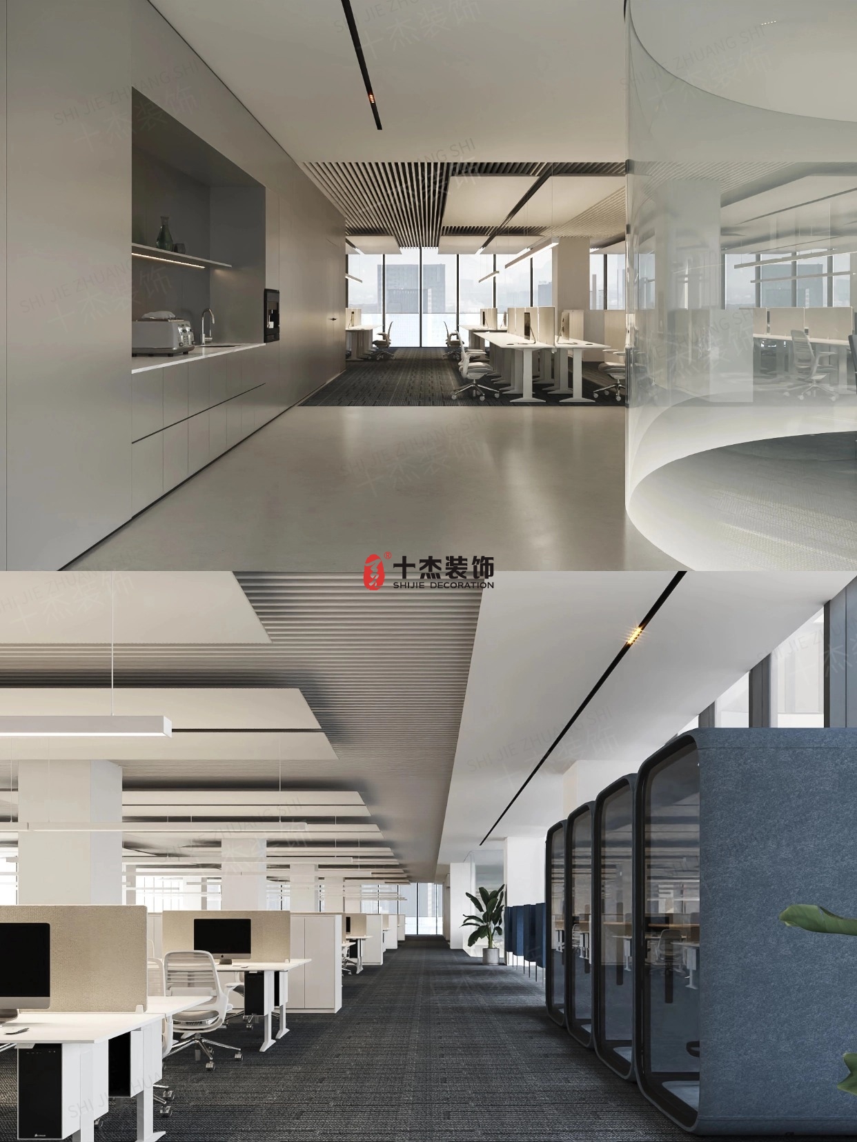 辦公區(qū):開放工位+獨(dú)立玻璃間自由切換,協(xié)作與隱私兼顧