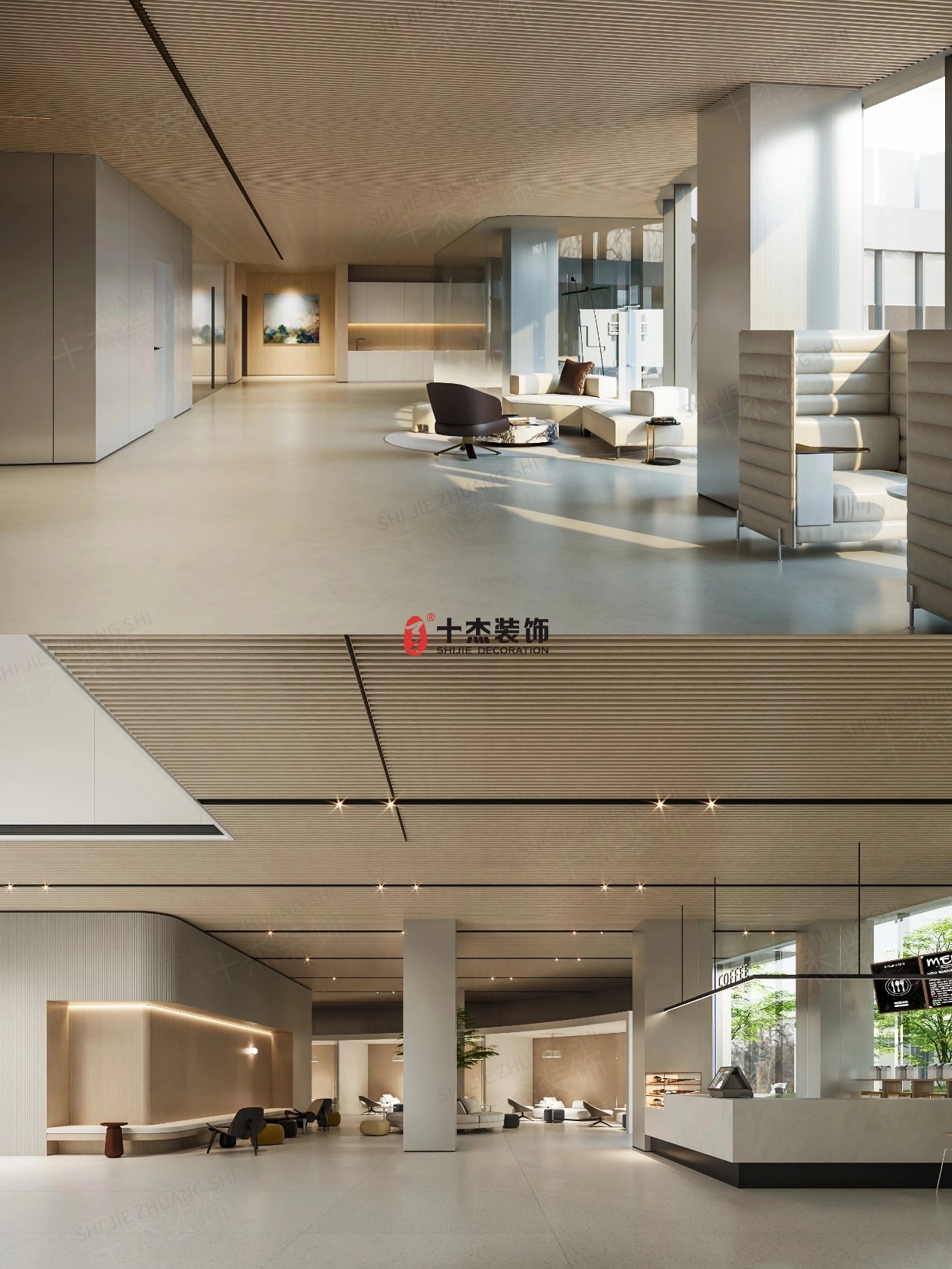 吊頂用鋁方通+懸浮燈帶,藏管線、顯層高,還能安靜開會(huì)