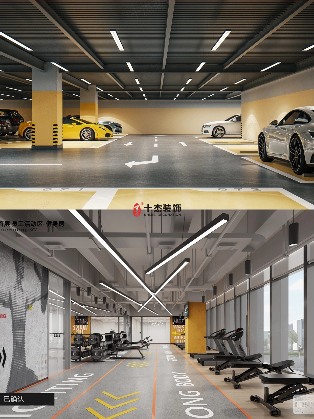 連停車場都用熒光黃做導(dǎo)視,健身房地膠印激勵(lì)標(biāo)語??,功能區(qū)細(xì)節(jié)拉滿!